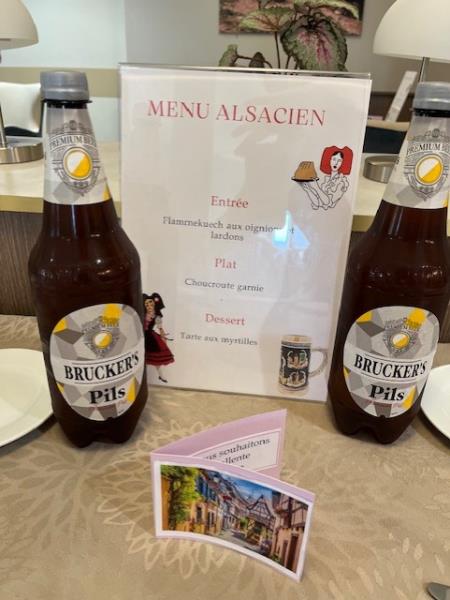 Dans le cadre des repas à thème, l’Alsace a été mise à l'honneur dans une ambiance chaleureuse mêlant traditions et convivialité. Les résidents ont savouré un déjeuner typiquement alsacien avec en entrée, la célèbre "tarte flambée", une généreuse choucroute garnie et une tartes aux myrtilles, le tout accompagné de bière, bien sûr. L’après-midi s'est poursuivi avec un quiz ludique sur l’histoire, les spécialités et les coutumes alsaciennes. Les échanges ont été nombreux et chacun a pu partager ses souvenirs ou découvertes. Cette journée gourmande et festive a offert un véritable voyage au cœur de cette belle région d’Alsace.
